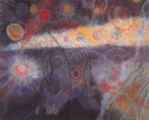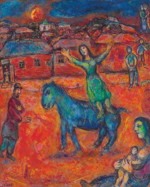 Curator: Immediately striking, isn't it? The vibrant, almost clashing colours grab your attention. Editor: They do! A primal, almost visceral response to that bold use of colour. What exactly are we looking at? Curator: This is Marc Chagall's "La Bastille, étude", from 1954. It's fascinating how Chagall combines figuration, cityscape, and that distinct expressionist touch. Notice the impasto—the thickly applied paint—it lends a real texture and energy to the surface. Editor: The subject matter seems secondary to the application of the pigment itself. It makes one wonder about the availability and quality of the paint itself. These blues and reds, for example, speak to industrial developments. Curator: Interesting. Considering its creation date, one can interpret "La Bastille, étude" as part of post-war discourse around nationhood and resilience. Editor: It looks more like naive art with folk themes to me than making any grand political statement. Curator: But consider where this work might have been displayed: museums, galleries—places where ideas about national identity were debated and solidified after a period of massive upheaval. Even this art can influence those public roles of memory and imagery! Editor: I wonder about his process though. Was this oil paint commercially manufactured, or did Chagall employ assistants? Did the dealer control production via contract? Curator: Well, it gives us plenty to consider; from his personal choices in representation to its public-facing implications in art and social history. Editor: Exactly. How the labour shapes meaning, beyond purely representational interpretation. Thank you for sharing!