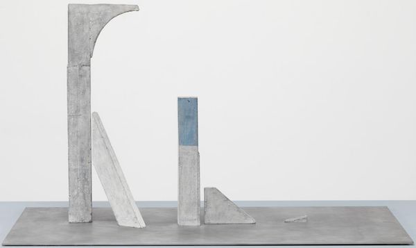 Editor: This is Christopher Wilmarth’s "Little Bent Memphis" created in 1971. It appears to be made of metal. The sculpture feels quite austere, with a strong emphasis on geometry. What can you tell me about how the structure contributes to its meaning? Curator: Well, let us observe closely. Notice how Wilmarth divides the composition into three distinct segments, yet links them via a linear progression. What effect does this have on your reading of the piece? Editor: It almost feels like different states of being, connected, but separate… Like a beginning, middle, and end laid out linearly. Curator: Precisely. And consider the properties of the materials he employs. The subtle transparency and industrial feel suggest a blending of vulnerability and strength. Observe how light interacts with the piece, creating subtle shifts in tone. It emphasizes its presence in space through reflection and shadow play. Does the placement of the vertical line strike you as intentional? Editor: Definitely! It adds a stark, vertical interruption to the otherwise horizontal flow. It seems to slice through the artwork and adds tension to the piece, especially compared to the softness of the rest of the sculpture. Curator: It's the singular linear element juxtaposed against the broader geometric forms, generating a visual dialogue. The sculpture eschews overt narrative and becomes about the spatial relationships of form. This pushes the boundaries of how a traditional sculpture communicates with an audience. Editor: I see how the work prompts us to contemplate its physical construction first, and consider broader narratives later. Curator: Indeed. Focusing on its tangible presence makes the artwork less about its title or intent and more about our phenomenological encounter with geometric forms and industrial materials. Editor: I understand the work better now, as I appreciate the deliberate construction. It definitely leans into formalism by showing the raw structure of the art piece and materials.