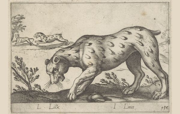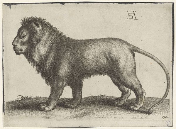 Curator: This is Antonio Tempesta's "Standing Tiger," residing here at the Harvard Art Museums. Look at the intense focus in the tiger's eyes. What's your immediate take? Editor: Grumpy. He looks so grumpy! And all those tiny lines, giving him this almost prickly feel. Curator: Well, Tempesta, born in 1555, was quite the printmaker. It's important to remember the labor and the materials used to create the print. The crosshatching really defines the form. Editor: It’s like he’s trying to make something ferocious, but it comes off…endearing? I keep wanting to give him a pat on the head, even though he looks like he wants to bite mine off. Curator: Perhaps that was the intent. To show the duality of nature, its power, and its vulnerability within our own social constructs? Editor: Maybe. Or maybe Tempesta just had a bad day and needed to draw a cranky cat. Either way, I like him. Curator: A fascinating example of a culture trying to understand its own relation to the natural world. Editor: Exactly. A cranky, prickly window into the past!