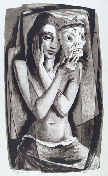 Benton Spruance made this lithograph, Girl with Mask, using black ink. The cool thing about printmaking is the way the artist has to think backwards, almost like a mirror image of painting. Look closely and you can see how the velvety blacks create an image of both intimacy and theatricality. The texture of the lithographic stone gives the image a soft, almost dreamlike quality. The girl's skin seems to glow against the stark contrast of the mask she holds. It’s so interesting how the mask seems to mimic and mock the girl's own face. Like, who are we really? It’s a bit like the German Expressionist prints of Käthe Kollwitz, but there is also something here of Otto Dix's grotesque visions. I think it captures that feeling of uncertainty about identity. It’s like art is just one big conversation across time.