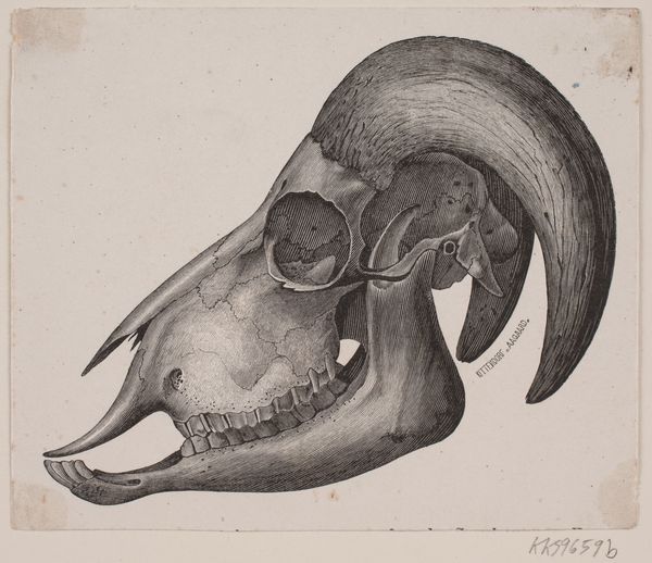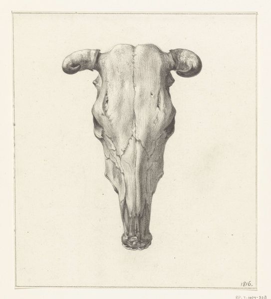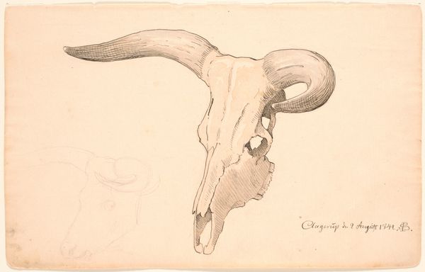 Editor: This is Johan Thomas Lundbye’s "Hjortekranium" – "Deer Skull" – a graphite and pencil drawing from 1839. There’s a stark, almost melancholic quality to it, even though it’s a straightforward depiction. What do you make of its simple power? Curator: Simplicity is key here. The skull, stripped bare, transcends mere anatomical study. What visual associations come to your mind? Editor: Well, Vanitas paintings obviously come to mind—that idea of skulls symbolizing mortality and the fleeting nature of life. Curator: Exactly! Skulls frequently function this way. It serves as a reminder of life’s ephemerality, inviting reflection on our existence and values. Note how Lundbye emphasizes texture – the rough surface suggests decay. What might that signify within a cultural context? Editor: Maybe it reflects a broader romantic sensibility, a fascination with ruins, relics and memento mori, a kind of beautiful sadness in the face of impermanence. But it's just a deer, right? Is that symbolic? Curator: Indeed, it could be viewed through a lens of hunting culture, representing prowess or respect for nature. Do you think its function is didactic or commemorative? Perhaps a fusion of both, hinting at existential questions. Editor: That’s fascinating – I hadn’t considered the layers of symbolism embedded in what seems like a straightforward drawing. It is clearly more than just a skull; it becomes a meditation on time, culture, and our place within the world. Curator: Precisely, and recognizing this enriches the viewing experience. Now, imagine seeing this in relation to other contemporary artworks, and the dialogue extends, right?