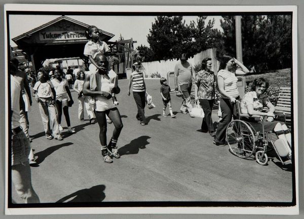 Curator: This black and white photograph, simply titled "Untitled (S.F. area 'Great America')" by Bill Dane, captures a seemingly mundane moment. I find it so compelling in its simplicity. Editor: It’s stark, isn't it? That high contrast and the casual pose of the figures creates a certain disquiet. It reminds me of captured memories and forgotten moments. Curator: Dane's work often explores overlooked aspects of American life. The light post seems like a symbolic sentinel, while the figures have a liminal presence, evoking youth and the suburban landscape. Editor: The fence almost acts as a social barrier, doesn't it? One figure trapped behind, the other nonchalantly perched atop, perhaps contemplating their position within the societal structure represented by 'Great America.' Curator: The 'Enter Gate' sign feels almost ironic. Is it an invitation or a restriction? Are we observers looking in, or participants about to step through? Editor: It speaks to the commodification of leisure, the way our experiences are curated, packaged, and sold back to us. Are we free, or are we simply acting out roles within a pre-determined script? Curator: Indeed. Dane encourages us to question the very nature of place and belonging within our manufactured environments. Editor: Well, it’s certainly given me pause to consider the deeper implications of these ordinary spaces. Thanks for shedding light on Dane’s work.