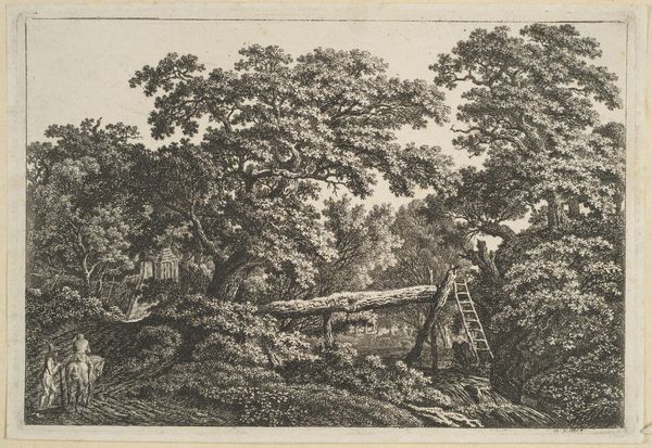 Curator: There’s an enchanting tranquility to this scene, wouldn't you agree? A quaint building nestles into the trees, a scene I could easily lose myself in. Editor: Indeed. We’re looking at “The Mill in the Wood," an etching by Anthonie Waterloo. Although the date of creation is unspecified, its stylistic characteristics place it firmly within the Baroque tradition. An interesting element of genre painting is at play within the idyllic scene. Curator: That term, Baroque, it speaks to a grandness and drama I wouldn't readily apply here. The details, the light filtering through leaves, they feel so delicate. The presence of figures and animals imply hard work at the same time they introduce narrative. Do you get a sense that its almost too quaint, too pastoral? Editor: Perhaps “baroque” isn’t immediately obvious, but consider the conventions of landscape in that era, especially in the Dutch context. Landscapes weren't simply records of a place. The details could carry significant cultural meaning, reinforcing social hierarchies. Here, even the placement of the mill signals the importance of industry. What's more, we cannot ignore its place within a tradition of printmaking. This allows wider distribution. This seemingly bucolic scene is actually a commodity. Curator: A commodity that speaks to class. What looks picturesque obscures the exploitation of the underclass that toils in these spaces. I am looking at that path and thinking of the ways people and pack animals had to labor so that landowners might be free to enjoy the shade in their forests. Editor: Precisely. Waterloos skill with etching helped bring such imagery to an expanding market for art among the bourgeoisie. So a scene such as this is actually circulating ideas and ideals about the rural economy within this very economy. Curator: Knowing this makes me look differently at the entire image. It takes the charm away from that wheel turning on the mill. I can start to feel that turning of labor grinding people down in its gears. Editor: That's what makes Waterloo's landscape so engaging for our time. Its delicate aesthetics masks the robust and somewhat harsh political realities it inevitably implicates. Curator: It also speaks to how landscapes shape so much more than what we see as passive beauty. The landscape’s very existence becomes embroiled in exploitation. This also helps us realize that every picture presents one view. Editor: Indeed. Hopefully listeners will appreciate it. It’s also a work in conversation, still offering critical perspectives for each viewer today.