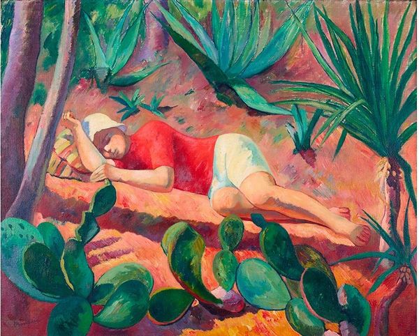 Curator: Lucian Freud's "Large Interior, Paddington," created in 1969, presents a compelling, intimate scene using oil paint. What strikes you first? Editor: It’s a slightly unsettling intimacy, wouldn't you say? The rawness of the figure contrasts so sharply with the delicate branches of the plant. There’s a palpable tension in the composition itself. Curator: Absolutely. The diagonal of the floorboards pulls our eye towards the figure, creating a deliberate spatial tension. But consider the way the stark light models her form, almost sculptural in its intensity. The texture becomes everything. Editor: Yes, there's something incredibly honest about how the body is rendered, almost confrontational. The figure is juxtaposed with the potted plant. What does that symbolize? A fragile beauty within a domestic space, perhaps? A suggestion of inner life bursting forth in unlikely places? Curator: The plant certainly introduces a dynamic element. Observe how the leaves and tendrils mimic the reclining figure’s languid pose. It's a kind of visual rhyme. I'm less convinced about symbolism and rather observe an arrangement of formal contrasts. Editor: But Freud rarely chooses objects randomly. Even that coat hanging askew seems laden with unspoken narrative. Isn’t this also about the vulnerability inherent in the act of viewing, in exposing such private moments to the public gaze? Curator: Undoubtedly. The unidealized body confronts the viewer directly. The material qualities—the oil paint itself applied thickly—become central. It subverts the tradition of portraiture to focus on sheer surface reality. Editor: Yet I cannot help but wonder about that title: "Large Interior, Paddington." The location seems almost incidental, yet the scale of "Large" suggests that this interior isn't merely physical, but perhaps emotional, psychological...a vast, uncharted territory. Curator: A fruitful suggestion indeed. What remains fascinating is that by embracing pure form, by insisting on unflinching observation, Freud nevertheless delivers something deeply emotive. Editor: Ultimately, it seems that even when form takes center stage, the enduring power of symbol and human empathy lingers in the corners of perception. A perfect melding of intention.