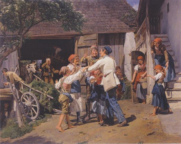 Editor: This is Ferdinand Georg Waldmüller's "Return from the Church Fair," painted in 1859, using oil paints. There's such a vibrant energy here! What catches your eye, and how do you interpret this bustling scene? Curator: The work’s apparent celebration of community is exactly where its politics lie. Waldmüller, painting in mid-19th century Austria, offers a romanticized, possibly nostalgic, view of rural life. Consider who is centered and who is absent. Do we see the realities of peasant labor or poverty reflected here, or are those realities being deliberately softened, even erased? How does this idyllic portrayal serve the dominant ideology of the time? Editor: That’s interesting. I was mostly drawn to the lively figures and bright colors, but I hadn’t considered what might be missing. So, you're saying it’s not just a snapshot of a fair, but also a statement – perhaps even a strategic one? Curator: Precisely! The Realist style can mask a lot. Consider, too, how gender roles are presented. The women and children are prominently featured in a domestic sphere; what stories are silenced by this? Think about the rise of nationalism during this period. Are these ‘happy peasants’ actually symbolic of a particular nationalist ideal being promoted at the time? What could that mean in a diverse empire like Austria? Editor: So it’s less about what’s there and more about the historical forces shaping what’s *not* shown, and how what is shown is framed. Thanks, that gives me so much to think about in terms of artistic and societal messaging. Curator: It's a reminder to engage with art critically, understanding that paintings are rarely neutral documents but instead active participants in broader conversations about power, identity, and social structures.