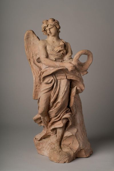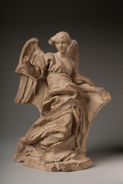 Editor: Here we have Gian Lorenzo Bernini's "Angel with the Scourge," currently at the Harvard Art Museums. I’m struck by how raw the terracotta looks, almost like unfired clay. What can you tell me about this piece? Curator: Considering Bernini’s masterful manipulation of marble, this terracotta model reveals a different side. How does the materiality inform our understanding of the final work it was intended for? Does the inherent labor, in both terracotta and marble, influence your interpretation? Editor: That’s a fantastic question. I never really thought about the angel in terms of the labor and production it took to create it. Thanks!