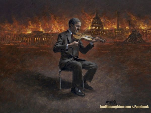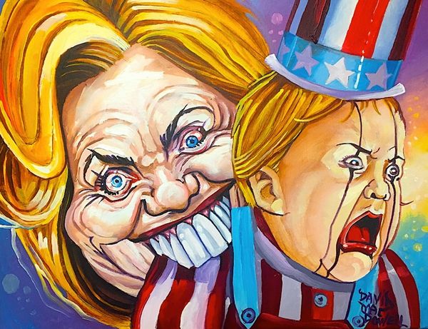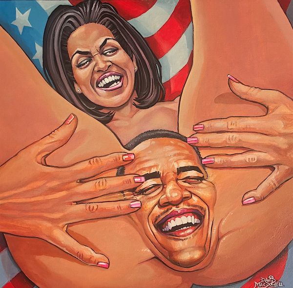 Curator: Oh, wow, what an intriguing image. I'm immediately drawn to the vibrant colours and the rather intense expressions on the figures' faces. There's a certain tension in the air, don't you think? Editor: Absolutely. This painting is called "Straight Outta Kenya" by Dave Macdowell, though it's not currently dated. The artist appears to be working with acrylics on canvas to present what you might call a pop-surrealist interpretation. What’s immediately apparent is the striking juxtaposition of Barack Obama and another figure in an emotionally charged encounter. Curator: Yes! Obama, depicted in a tuxedo with an "O" resembling his campaign logo, is locked in an embrace of sorts with another man whose American flag shirt seems to be, well, spontaneously combusting. The "Straight Outta Kenya" title gives me a lot to consider. The racial and political implications are simmering right under the surface here. Editor: Indeed. I see Macdowell engaging with Obama's complex public image and, potentially, the mixed feelings and turbulent political climate surrounding his presidency. I wonder about his choice of painting this as an encounter between two figures, both apparently experiencing intense emotions. It reads almost as performance. Curator: The blazing shirt feels particularly loaded. Is it about the burden or heat of American identity, especially in relation to black identity in America? Perhaps, it references a rejection of or feeling consumed by American expectations, considering Obama's unique position. Editor: Possibly. Notice the seemingly mundane detail of the White Castle bag held between them; it anchors the piece in contemporary American culture, contrasting with the almost allegorical flames. Such imagery makes me think of the critical conversations occurring within artistic circles, examining popular culture and its intersections with politics. Macdowell’s composition seems designed to create a certain level of discomfort. Curator: Absolutely, this is clearly not passive viewing. As viewers, we're positioned to engage with discomfort, question power structures, and consider intersectional identities, wouldn't you say? This painting really urges us to ask what aspects of identity burn, smolder or are consumed when placed in specific social contexts. Editor: It does provoke quite a visceral response and situates us within an active discourse concerning public personas and their societal impact. This is definitely a work that will stay with you and invite questions.