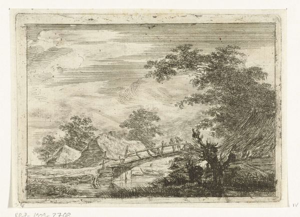 Editor: Here we have "Landscape with Hunter and Dog" by Ernst Willem Jan Bagelaar, created sometime between 1798 and 1837. It's an engraving, which gives it this incredible level of detail despite the limited tonal range. It feels like a really idealized view of nature; what stands out to you about this piece? Curator: The most compelling aspect for me is the labor embedded within. Look at the uniformity of the engraved lines defining the sky; the repetitive action required to create that is immense. It also highlights a social commentary, doesn’t it? The printmaking process democratized images, moving them away from unique, elite artworks and making them available for wider consumption. Editor: That's fascinating. I was so focused on the Romantic aesthetic of the scene itself. I hadn't thought about the production of the print and its distribution. Curator: Consider the engraver's role. They are mediating nature and disseminating it. Think about the societal context – urbanization was increasing, separating people from agrarian lifestyles. This print is a commodity. It’s presenting a carefully constructed vision of rural life for consumption. What's being bought and sold here is not just a landscape, but also a feeling, an idea, and perhaps even a yearning for something lost. Editor: So, the "landscape" itself is almost secondary to the processes of creating and then distributing it? Curator: Not secondary, intrinsically linked! The image is entirely defined by those processes, both physically and conceptually. The hunter, dog, trees – they become signifiers within a material transaction. The Romantic ideal, here, serves as a commodity, shaped by the very labor that brought it into being. Editor: I never really considered the economic aspect of Romanticism before! It really changes my understanding of not just this piece, but the whole genre. Thank you! Curator: It’s a two-way street; looking at the tangible elements opens us up to broader ideas and vice versa!