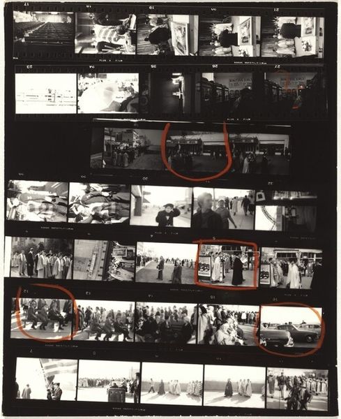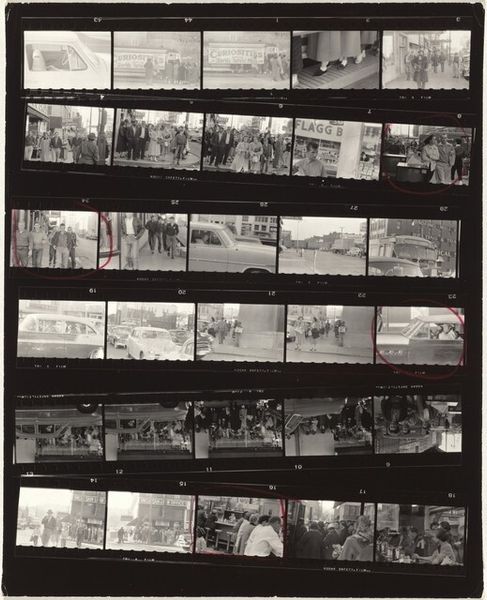 Curator: "Guggenheim 390--Gallup, New Mexico" by Robert Frank. Shot in 1955 using film. It is a Gelatin-silver print. Editor: At first glance, this seems to be an arrangement of sequential photographs. There are multiple shots, candid slices of small-town American life... very slice-of-life! As a set of works within one physical piece, how can you interpret these photos in conjunction? Curator: The presentation is indeed part of its construction. Frank offers here a glimpse into a certain experience by dividing moments from that era into singular frames. The black border calls into question which specific moment of light the observer chooses to view. It offers one of many, calling the selection process to attention. Editor: This is intriguing. So you suggest Frank intentionally fragments time. How do you see realism in its composition then, with time sliced up in this way? Curator: The reality is not lost or fractured by the dark film strip border, but, on the contrary, the emphasis brought to each photograph amplifies the gaze one is intended to bring towards it. There is a heavy grain in each photograph too; these formal attributes are intentional to produce a certain image to which his other photographic images contrast. The image as a collective must speak for itself. Is it not the role of the artist to select that which will ultimately comprise its overall composition? Editor: That's interesting, the way you point out how each snapshot functions to construct its whole meaning, even down to the intentional heavy grain. What is revealed to the viewer by dissecting the parts within the context of one whole? Curator: Perhaps this format provides another look into that time period, into each still. He directs the flow in its formalistic approach; and Frank may lead the observer down various aesthetic or critical routes that would reveal even more cultural signifiers of the subject. Editor: I see now. Thank you. Looking at it again, I appreciate the nuanced relationships of the parts. Curator: As do I. Each viewing lends itself to new considerations, no?