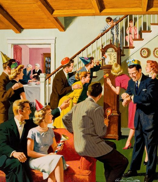 Editor: Here we have "One Date with the Boss," an oil painting from 1953 by Edwin Georgi. The scene seems quite charged – there’s a woman with a rather knowing look, another dripping with furs, and then a man tending to the first woman's leg. It feels…awkward, to say the least. How do you interpret this work? Curator: Indeed, "awkward" captures much of its tension. Considering the context of the 1950s, this image speaks volumes about power dynamics, and what constituted acceptable behavior in professional settings. Look at the framing – it’s like a stage, with the woman being the spectacle. Doesn't that positioning strike you as indicative of its time, revealing particular social structures? Editor: Yes, I see what you mean. It's staged and performative. Was this image likely meant as a critique or endorsement of the behavior depicted, do you think? Curator: That's the complex part. It likely wasn’t conceived as a blatant critique. Images like this were often ambiguous, reflecting existing power imbalances rather than challenging them directly. The knowing glance could be read as complicity, not necessarily resistance. Think about who was consuming this type of imagery, and how it reinforced specific societal roles. Editor: So, even if it's uncomfortable for us to view now, it could have been considered relatively normal, or even desirable, at the time? That’s a bit unsettling. Curator: Precisely. It’s a reminder that art is a product of its time and that what seems "normal" is culturally constructed. Considering it as portrait art under a Modernism art style highlights a focus on contemporary themes but does little to remove the tension we see. This picture underscores how museums, galleries, and sociopolitical powers contribute to shaping the artwork's production and reception. It’s not just about the individual scene but also the system that allowed it to occur. Editor: This has been really insightful. Thanks! It really shifted my understanding of the piece. Curator: My pleasure. Remember, viewing art through a historical lens opens up conversations about what imagery normalizes, obscures, and, perhaps, tries to justify within society.
