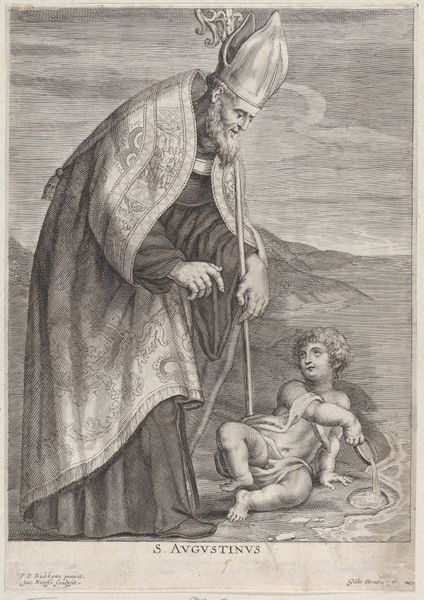 Nicolaes Lauwers made this print of H. Albertus van Trapani with the Christ Child and Mary, sometime in the 17th century. The scene combines earthly and celestial elements, reflecting the Catholic culture of the time. The print presents us with Albertus, a saint known for his miracles, holding the infant Christ while Mary looks on benevolently. Angels float above, bearing a scroll. Below them, a crowd of suffering people seek healing. This composition embodies core tenets of Catholicism, emphasizing the intercession of saints, the divine power of Christ, and the compassionate role of Mary. The imagery served to reinforce religious doctrine and inspire faith among the populace. Prints like this played a crucial role in disseminating religious ideas across Europe, especially during the Counter-Reformation. They would be displayed in churches, monasteries, and private homes to foster devotion and reaffirm the Church's authority. To understand this print more fully, we need to delve into the religious, political, and artistic contexts of 17th-century Europe. Investigating the lives of Albertus and Lauwers, along with the history of Catholic image-making, offers valuable insight into the complex interplay between art, religion, and society.