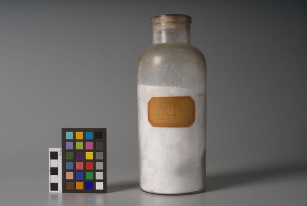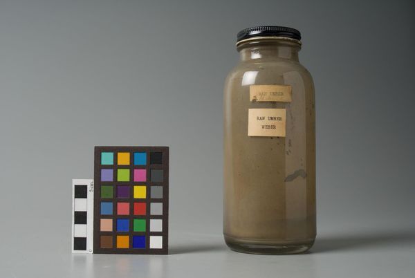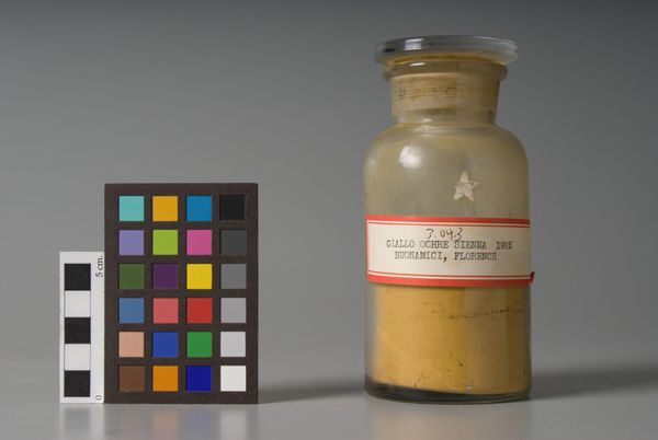 Editor: This is 'Raw Sienna', made by F. Weber & Company. It's simply a jar filled with pigment, but there's a kind of quiet beauty in its presentation, don't you think? What symbols or deeper meanings do you find in it? Curator: The jar itself, a vessel, speaks of containment and preservation – a common theme throughout cultural history. We see the color raw sienna, its earth tones reminding us of our material origins and the enduring link between art and the natural world. Editor: So, it's not just pigment, but a connection to history and nature. Curator: Precisely. Consider the simple label. It's not just an identifier, but a signifier of authenticity, and artistic tradition passed down through generations. What memories or feelings does the color itself evoke for you? Editor: I think of the warmth of the earth, and the longevity of art itself. Curator: Indeed. The bottle holds not just pigment, but the potential for countless artistic expressions. A powerful symbol of creation.