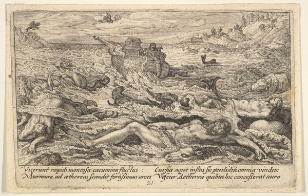 Curator: This is Antonio Tempesta’s "Plate 103: Neptune Sending a Deluge to Troy," created in 1606. The engraving depicts a scene from Ovid’s 'Metamorphoses' and it's currently housed here at the Metropolitan Museum of Art. Editor: Immediately, I'm struck by the chaos, a tempest within Tempesta, perhaps! Neptune, riding some monstrous seahorse thing, seems to relish his destructive power, doesn't he? Curator: The composition certainly conveys a sense of Baroque drama. The artist masterfully uses line and perspective to depict the overwhelming flood engulfing the city. Notice the intricate details, from the architectural rendering of Troy to Neptune's muscular physique. Editor: He really sells the deluge; you can practically taste the salt spray. But it also makes me think about broken promises. Laomedon welched on a deal, and now, watery vengeance. Does justice always need such a heavy hand, or in this case, a heavy trident? Curator: Indeed. The image is a powerful representation of divine retribution, steeped in classical mythology. The very lines are fraught with tension. Also note that Tempesta has woven the narrative expertly into the landscape. Editor: It's fascinating how the baroque, with its fondness for theatricality, dovetails with the almost operatic drama of Ovid. Neptune, that archetypal brooding god, becomes this imposing figure. Do you think Tempesta felt some sympathy for Troy? I sense a bit of melancholy. Curator: An interesting perspective! While Tempesta adheres to the conventions of historical narrative, one could argue the depiction of the inundated city invites reflection on human fallibility versus inexorable fate. Editor: There is definitely a looming mood about our place in the great chain of events, or should I say the flood of them. From that tiny plate, you almost hear the roar and the city tumbling down. Well, it’s been enlightening parsing all the watery allegory today. Curator: Quite. This print invites contemplation on themes of power, responsibility, and the delicate balance between humanity and the divine as channeled through masterful technique.