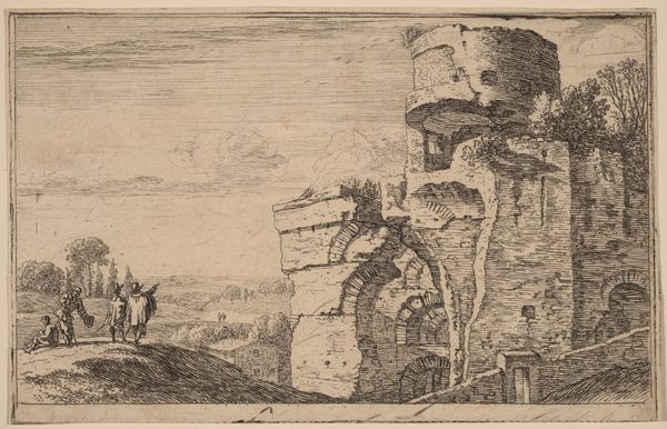Jan Both created this etching, titled 'Les Deux Vaches Au Bord De L'Eau,' using ink on paper in the 17th century. This serene pastoral scene offers a glimpse into the romanticized view of the Italian countryside favored by Dutch Golden Age painters. Here, the presence of the working class, along with their livestock, raises questions about labor, land, and the complex relationship between humans and nature. Are these figures merely picturesque elements, or do they hint at the economic realities that sustained the idyllic landscapes? Both's choice to depict ruins alongside the natural beauty invites reflection on the passage of time, and the rise and fall of civilizations, as well as the resilience of nature. How might the artist have viewed the relationship between the built environment and the natural world, especially given the Dutch Republic's own landscape transformations? Perhaps Both invites us to contemplate our place within this continuum.