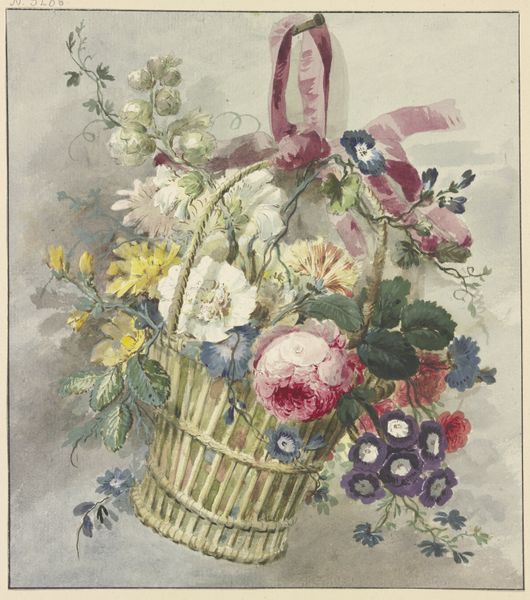 Angelo Rossi created this watercolor, Straw Hat with Roses, Carnations, and Cornflowers, during the 19th century. Immediately, the eye is drawn to the hat’s circular form, softened by the cascading arrangement of flowers. The textures, rendered delicately in watercolor, evoke a sense of gentle elegance and a dreamlike quality. Rossi's choice of subject and medium invites us to consider the structural dynamics at play. The hat, an object typically associated with utility and fashion, is transformed here into a study of form and color. The flowers, arranged seemingly at random, are in fact carefully composed to create a sense of depth and movement around the central void of the hat. The circular shape of the hat contrasts with the organic forms of the flowers, a tension that destabilizes any fixed interpretation. The painting does not merely represent; it engages in a semiotic interplay between object and adornment, utility and beauty. This interplay challenges our perception of everyday objects, inviting us to see them anew.