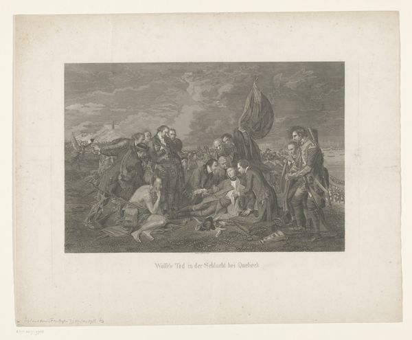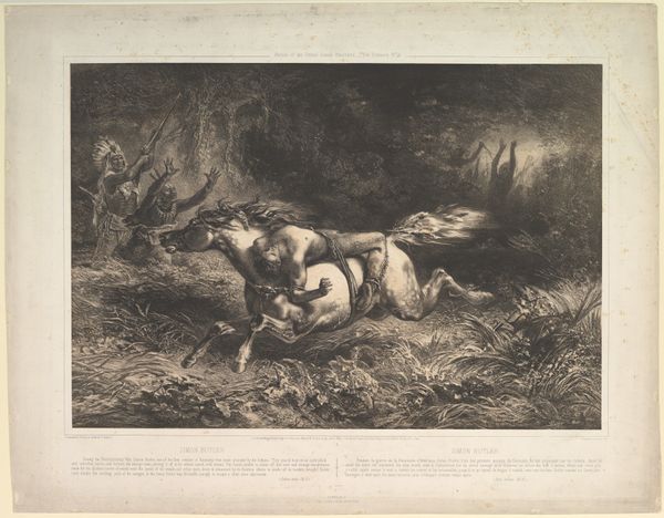 Editor: This is "Willem met de Hoorn, graaf van Orange, bestrijdt de Moren," or "William with the Horn, Count of Orange, battles the Moors" by Dominicus Anthonius Peduzzi, made between 1849 and 1861. It's an engraving, and it feels dramatic and a bit chaotic. What symbolic meanings do you find embedded in this print? Curator: Consider the symbolism inherent in the figures themselves. The “Moor” in European iconography carried connotations of the exotic “Other” — a figure of both fear and fascination. Does William’s triumph represent something larger? Is it a cultural touchstone referencing European power against a perceived foreign threat? Editor: I see. So, it's not just a historical battle; it's loaded with deeper implications. Curator: Exactly. The symbols operate on multiple levels. Note how William is centered and upright. What might this suggest about moral authority? Now consider what the fallen Moor signifies in terms of symbolic defeat. Is it simply military? Or is something more complex occurring in the visual language of the time? Editor: That makes sense. The fallen figures clearly represent more than just physical defeat. It's about dominance. It makes me think of propaganda. Curator: Precisely. Consider too the choice of engraving. What effect does the starkness and precision lend to this scene of conflict and what narratives of conflict were circulated at the time the piece was made? Editor: It really gives a clear, defined message. This has really given me a fresh look at how images carry historical weight and cultural perspectives. Curator: And, importantly, how they perpetuate certain narratives over time, shaping our understanding of history. It highlights the potent intersection of art, culture, and ideology, don't you agree?