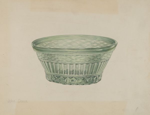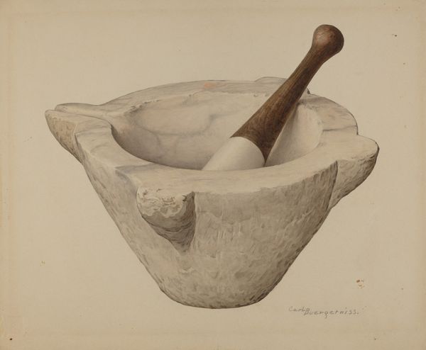 Editor: This is Frank Fumagalli’s "Wash Bowl," from around 1937, done in pencil. It’s a simple subject, but there's a stillness and quiet dignity in the composition. What do you see when you look at this work? Curator: The eye is immediately drawn to the craftsmanship evident in Fumagalli's technique. Note how he has skillfully rendered the textures – the smooth surface of the bowl, the subtle marbling effects – through careful shading and line work. It’s almost trompe l'oeil. Editor: It does look incredibly realistic, especially considering it's just pencil on paper. Curator: Precisely. The drawing style, though seemingly straightforward, showcases a refined control over light and shadow to convey form and depth. Look at how the interior of the bowl is treated, the way the light catches the undulating curves. What sort of feeling do you derive from those formal aspects? Editor: I see what you mean. It adds complexity and makes it much more interesting. I think I like the feeling of quiet observation and maybe a touch of classical formality. It's both simple and very skilled. Curator: Indeed. While the object depicted is quotidian, Fumagalli elevates it through rigorous application of artistic principles. The success of this work rests not on subject matter but the formal arrangement and meticulous execution. Editor: It makes you appreciate the humble washbowl anew. I learned something about appreciating the artist's hand in this particular work, in rendering texture and in elevating it. Curator: And I appreciate you highlighting how it transforms such a basic subject with only form. It confirms that the artist can truly guide our eye.