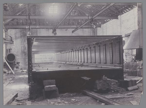 Curator: This arresting image is titled "Untitled (empty warehouse; men in doorway)" by John Deusing, its dimensions roughly 8 by 10 inches. Editor: My initial impression is one of stark emptiness—the monochrome palette amplifies the desolation. Curator: Indeed. The composition is dominated by receding lines, drawing the eye towards the ambiguous figures in the doorway at the back. Consider how Deusing crafts depth. Editor: I'm struck by how this captures the often-overlooked spaces of industrial decline, a poignant commentary on labor and abandonment. Curator: An apt reading. The geometry of the warehouse confronts the human form, stark and unavoidable. Editor: Ultimately, it is this contrast that I find most compelling. It humanizes the space, revealing the story through its bare bones. Curator: A space where absence itself becomes a central element, a key structural component of the work. Editor: Precisely. A powerful testament to the stories held within these forgotten corners.