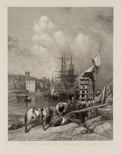 Curator: This is "Falmouth from the Mills," an engraving by J. Cousen after Clarkson Stanfield, now held at the Tate. I am struck by the layering of forms—it is almost claustrophobic, isn't it? Editor: I see more than just shapes. The horse, the worker, the mill, the ship...it speaks of connection—linking the natural and the mechanical, the human to grander ambitions. Falmouth as a nexus. Curator: True, but the composition is masterful. See how the artist uses the diagonal of the shoreline to guide our eye, the mill framing the ship beyond? The interplay of light and shadow creates depth, even within this limited palette. Editor: Indeed. And the ship itself, in this context, is a potent symbol of adventure, trade, and perhaps even dreams of escape from the daily grind. Curator: It's a very dynamic blend of the quotidian and the aspirational. I appreciate your perspective on this piece. Editor: Likewise. This engraving speaks volumes, doesn't it? It's more than just lines on paper; it's a historical memory etched into being.