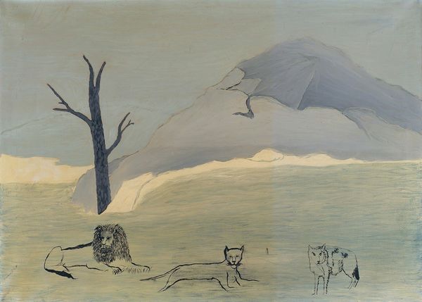 Editor: Here we have Niko Pirosmani’s "Hunting Scene with a View of the Black Sea," painted in 1912. It’s oil on cloth and gives this impression of a landscape frozen in time. There’s something both naive and incredibly impactful about it. What do you see in this piece, particularly given its context? Curator: I see a powerful commentary on the societal structures of Pirosmani's Georgia. Hunting, historically a pursuit of the aristocracy, is juxtaposed with the Black Sea, a vital trade route and a symbol of Georgia's connection to the world. Note how the figures engaged in labor coexist within the hunting tableau. What does it suggest about the artist’s perspective on class and access? Editor: So, it's not just a scene, but almost a layering of different worlds, right? The hunters, the Black Sea traders, the animals... Is it maybe a critique of social mobility, or perhaps its absence? Curator: Precisely. Consider the historical moment: Georgia was on the cusp of immense change. Pirosmani, often marginalized himself, captures this tension beautifully. His deliberately flattened perspective could even symbolize the limited perspectives and rigid hierarchies of his time. Do you think the naivety that you perceived challenges the traditional expectations of landscape painting? Editor: It definitely does. By simplifying forms and emphasizing certain details, he makes you focus on these individual narratives instead of being overwhelmed by the grandeur of the landscape itself. So the animals are given importance beyond the human? Curator: Exactly. Their presence is significant; their fate intertwined with the hunters but they have agency of movement within their own space, almost mirroring that of Georgian culture trying to coexist during a period of colonial power games. And it's essential to consider Pirosmani's background; he identified with the margins. This makes us view this work through a lens of social critique. Editor: I never would have looked at it this way. This painting suddenly feels so much more complex than a simple snapshot of a hunting scene. Curator: Indeed. Art can become a mirror reflecting society, as we found here in Pirosmani's work.