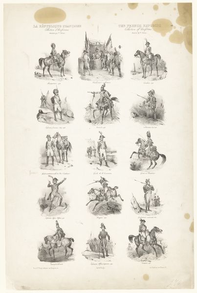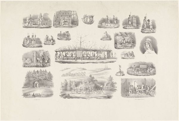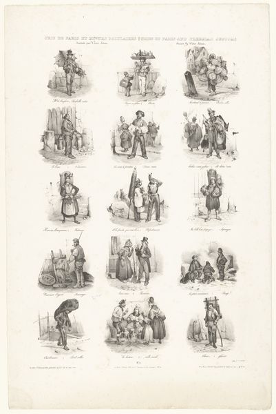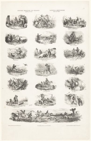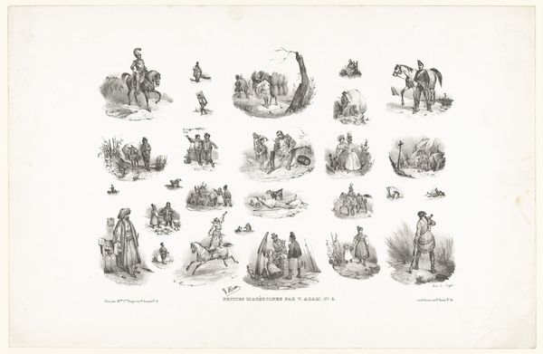This lithograph, titled "22 voorstellingen van mensen en dieren" (22 Depictions of People and Animals) was created by Victor Adam, likely sometime in the mid-19th century. Its graphic quality immediately stands out, achieved through the stark contrast between the dense, dark lines and the bright white paper. Adam has arranged twenty-two vignettes across the page, each a miniature study of everyday life. The composition is not random; there’s a visual rhythm established by the varying sizes and densities of the scenes, guiding the viewer's eye across the artwork. This arrangement could be seen as a reflection of the period’s interest in cataloging and classifying the world, akin to a visual taxonomy of social types and activities. The use of lithography allows for a detailed, almost photographic rendering of each scene, despite the absence of color. Each small depiction becomes a sign, contributing to a larger narrative about 19th-century life. In doing so, the artwork creates a dialogue, an ongoing interpretation between the artist's intention, the graphic structure, and our contemporary understanding.