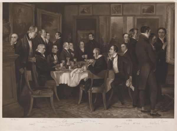 Editor: Here we have Christian Schussele's "President Lincoln and His Cabinet," created sometime between 1856 and 1866, a print made from pencil drawings. It strikes me as a very staged, formal portrait of power – almost like a historical tableau vivant. What story do you think the artist is trying to tell? Curator: Oh, it’s more than a story, dear! It’s a conjuring. Look at how the light seems to emanate from within Lincoln, yet it catches the worry etched on his face, echoed in the posture of his cabinet. Schussele is grappling with the immense weight of leadership during a fracturing nation. The piece almost feels like a premonition, don't you think? Considering the date range, one can only imagine the drama that swirled around its creation! It's less about capturing a moment, and more about embalming an era with lead. What do you make of that vacant chair, though? Editor: It does add an eerie presence, almost like a ghost at the table. Maybe a missing advisor? So you’re saying the artist's mood adds a subtle emotional layer? I assumed the men must have had a meeting with a vacant chair and the artist merely copied their seating style. Curator: Absolutely! Art always imitates. Is the men sitting at the table mere accident of artistic impression? I want to hear what you imagine about Lincoln in the room. Editor: This print has given me new insights into 19th-century portraiture beyond a desire for simple visual representation. Now I am starting to realize that the choice in subject matters from portraits and still life reflects the socio-political environment! Curator: Exactly! I believe we've cracked something fundamental here today!