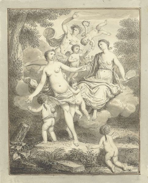 Curator: This engraving, "Jupiter and Io," is by Remi Henri Joseph Delvaux and is part of the Harvard Art Museums collection. Editor: It feels dramatic, almost theatrical, with the figures emerging from swirling clouds. The light and shadow create such a stark contrast. Curator: The story comes from Ovid's Metamorphoses. Jupiter, to hide his affair with Io from his wife Juno, transforms Io into a heifer, hence the rising into clouds. The visual language presents women in vulnerable positions. Editor: Interesting. I’m drawn to the composition itself—the diagonal lines of the clouds create movement, and the positioning of the figures guides your eye. Delvaux really understands the formal aspects of his craft. Curator: I agree, the artist certainly captures the drama inherent in the mythological narrative but such stories told visually are always from a patriarchal perspective. It's important to consider how such images reinforce social hierarchies. Editor: Indeed. It's a powerful piece, even if its themes are not exactly progressive by today’s standards. Curator: A strong example of mythological interpretations of the time and its complicated legacy, certainly.