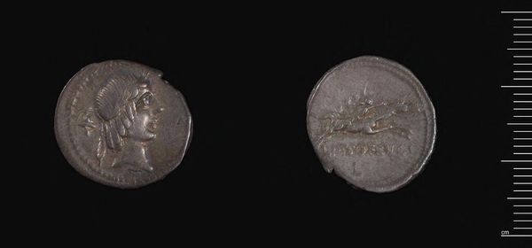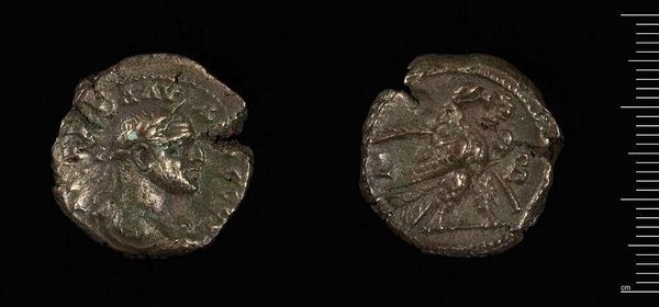 Editor: This is a Denarius of Antoninus Pius. Seeing both sides displayed here, I'm curious about what the imagery was intended to convey. What can you tell me about the symbols and figures chosen for this coin? Curator: The coin becomes a powerful instrument of imperial communication. Note the portrait of Antoninus Pius himself. What does projecting his image achieve? And on the reverse, we see symbolic figures, often representing virtues or divine attributes. What impression do you think it leaves when you can carry such virtues in your pocket? Editor: So, it's a way to make abstract ideas like virtue more tangible and relatable? Curator: Exactly! The symbolism of coins offers unique insights into the cultural values. I’m walking away seeing the power of symbolic figures.