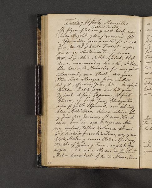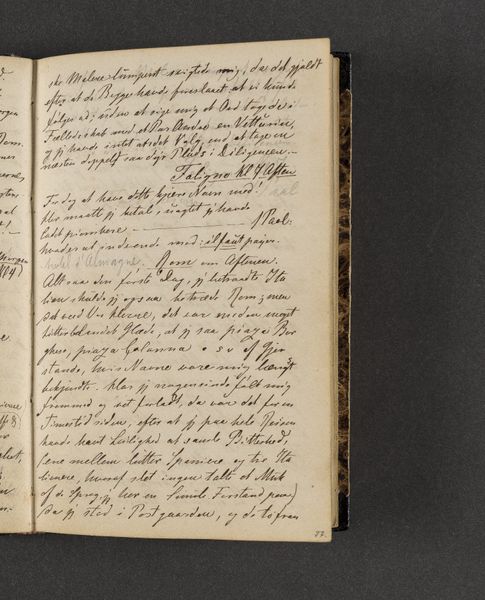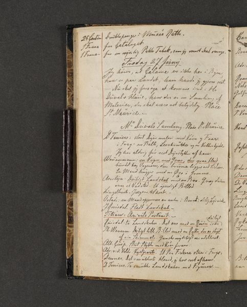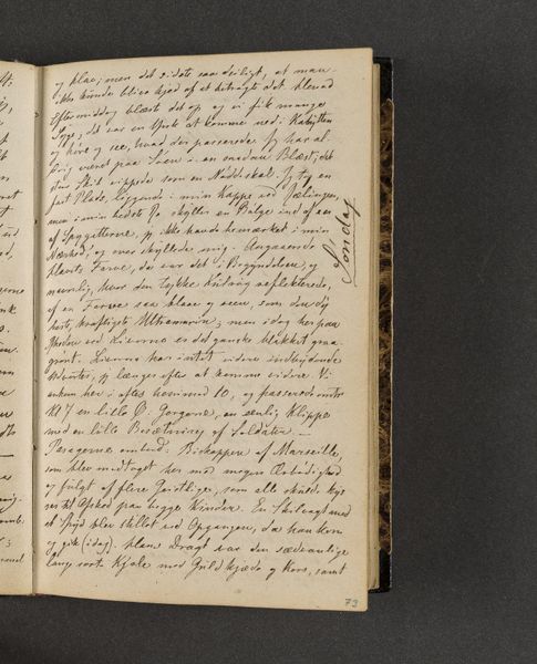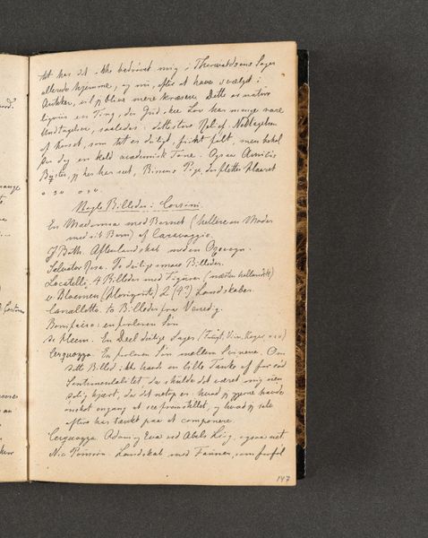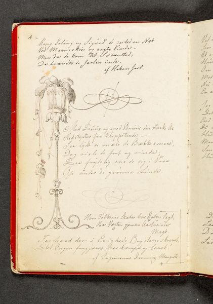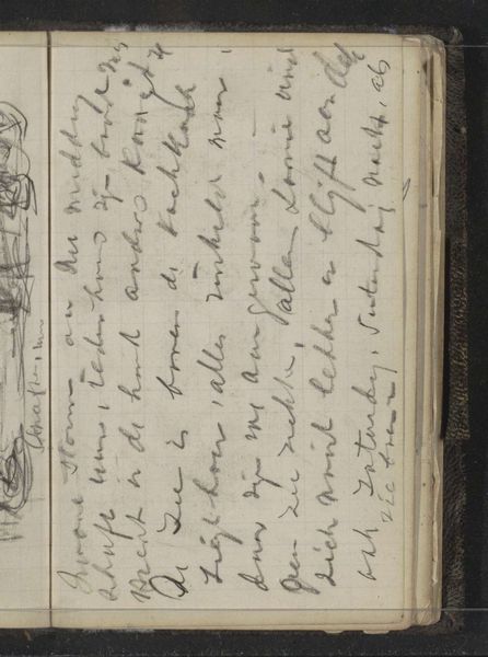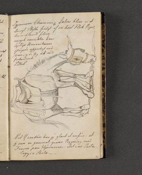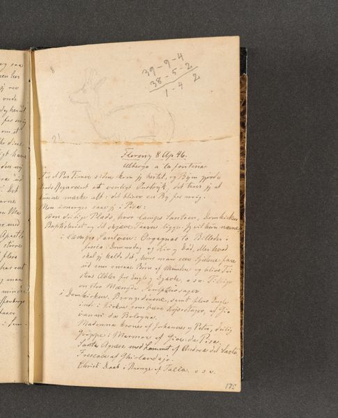 Curator: We’re looking at "Rejsedagbog," or "Travel Journal," an 1845 drawing by Johan Thomas Lundbye, held at the SMK, the National Gallery of Denmark. Editor: My first impression is one of intimate observation. There's a sketch of an animal—maybe a deer or antelope?—on the right-hand page, seemingly captured on the spot with quick pencil strokes. It's a delicate drawing, softened by age. Curator: Lundbye was deeply invested in the aesthetics of Romanticism. Consider how the subject, this animal, might symbolize our inherent connection with nature—a tenet so prized by the Romantics. Note the detail in the eyes; it gives a profound sense of sentience. Editor: Absolutely. And let's contextualize Lundbye's artistic practice within his broader engagement with nationalism. He was very interested in creating images that resonated with a Danish national identity, in a way to construct the essence of Danishness through depictions of the landscape, animals, and even people. Curator: Yes, one could suggest that the loose handling of pencil is essential. Look how Lundbye models the animal’s head—simple cross-hatching delineates form without closing it off. The blankness of the page even accentuates the animal, directing focus. Editor: But beyond the formal rendering, it’s necessary to look critically at who is afforded representation and how. Lundbye's romanticization of nature often glosses over the lived experiences and labor of people within those landscapes, further centering a specific bourgeois perspective. Curator: Fair. The sketch of the animal demonstrates both observation and abstraction, capturing the fleeting image during travel while still producing a finished composition. Editor: And it reminds us that landscape and nature have historically been fraught spaces of power, identity, and representation. Even a simple travel sketch holds deeper cultural significance. Curator: I see now, it shows us how seemingly benign or straightforward images participate in more complicated power dynamics. Editor: Precisely. Looking closer, we realize this image invites layered readings.