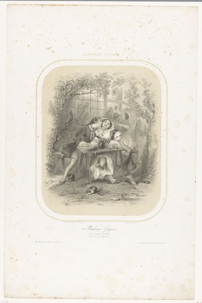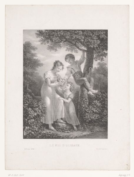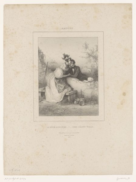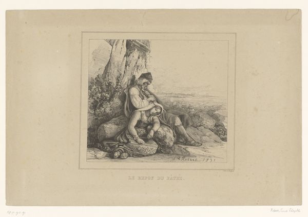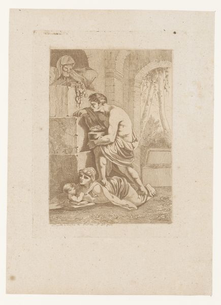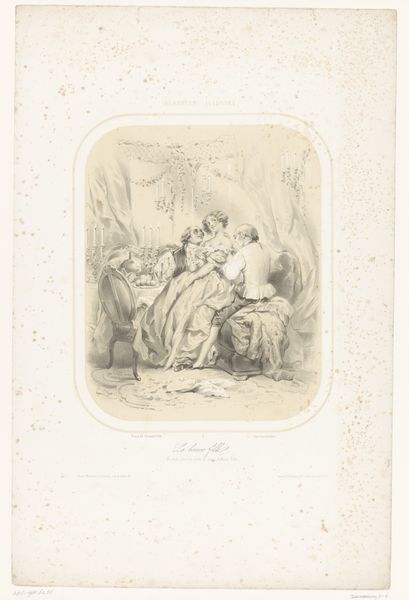 Curator: This delicate pencil drawing, made between 1855 and 1856, is entitled "Venus voelt aan de pijlpunt van Cupido," or "Venus Feeling Cupid's Arrowhead" by Charles Bargue. It’s quite a sentimental scene. Editor: The textures, particularly in Venus' drapery, strike me first. You can practically feel the weave of the cloth through the varying pressure of the pencil. Curator: Precisely! The almost photorealistic shading that renders both Venus and Cupid showcases the influence of Academic Art during this time. There's also an undeniably romantic and idealized approach to representing these mythological figures. We must acknowledge the cultural context in which the male gaze dictated portrayals of women, particularly goddesses. Editor: That link between industrial-era techniques of image reproduction and the continued depiction of idealized, timeless bodies is interesting. What kind of pencil do you think Bargue employed to achieve such gradients? How was pencil manufacturing developing? Curator: We know that Bargue created it as a lithographic model. I'd also like to discuss the implicit power dynamics between Venus and Cupid, here portrayed not just as mother and child but also within the broader sociopolitical context of idealized femininity versus mischievous male authority. It brings questions of agency and control into sharp relief. Editor: Power definitely exists within the gaze represented here. However, this makes me think about the socio-economic position of lithography at that moment in history. Reproducibility opened channels of accessibility to those who might not be able to afford an original piece of artwork. How were the illustrations distributed and who bought them? Curator: Those economic dimensions are really important for us to remember! In reassessing this artwork today, we recognize these factors but simultaneously allow space for more modern feminist interpretations that acknowledge these complex layers within depictions of femininity. Editor: It's a compelling reminder that art history is always a conversation, an exchange between the object, its maker, its multiple audiences. Thank you for your thoughts. Curator: Yes, it is a continuous cycle of contextualisation and recontextualisation.
