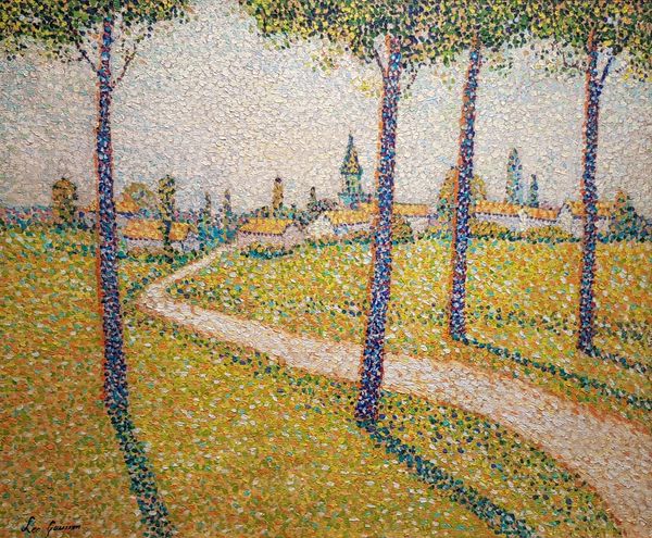 Curator: Paul Signac's "The Velodrome," completed in 1899, gives us a glimpse into a bustling bicycle race of the era. Note the oil paint, so characteristic of his neo-impressionistic technique. Editor: My first impression is sunshine! The painting bursts with yellow and the atmosphere just feels energetic. Is that the Petit Parc in the background? Curator: Indeed! You have a sharp eye for the symbolism here. The juxtaposition of leisure – the bicycle race – against the backdrop of factories signals changing attitudes toward industrialization, doesn’t it? Editor: Absolutely. But also, the riders circling evoke something primal: wheels repeating motion, like a dance. Notice the little umbrella pops that form little spots of contrast amidst the crowds... Curator: Which is typical for Signac's pointillist style. Consider that this image is entirely made up of distinct dots; observe that application of paint. These are not blended, allowing optical mixing within the viewer’s eye, thus producing such a heightened chromatic effect. What thoughts does it evoke in regards to its cultural context? Editor: What I am struck by are the advertisements on the stadium, painted prominently! How can we separate these brands, symbols of progress and industry, from the leisure that is suggested in the event? The consumer spectacle comes into full swing. Curator: Very insightful observation about consumerism beginning in plain sight within cultural memory. These leisure spaces served commercial interests even then. Editor: Thinking about these overlapping cultural themes, "The Velodrome" captures both speed and standstill, commercial frenzy and fleeting moment. It resonates even now, echoing themes that were prevalent in their society then that persist in the present day. Curator: Absolutely! And on closer look, analyzing these historical practices and social functions behind this art making is truly essential to how this work persists within cultural understanding.