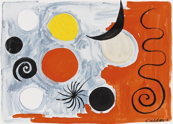 Editor: Alexander Calder's "Elements in Orbit," painted in 1956 with acrylic, presents a fascinating collection of shapes. The primary colors pop against the stark black and white elements. What do you see in this piece, especially regarding its composition? Curator: The painting compels an analytical look at its formal arrangement. The interaction between line and solid form predominates. Note how the artist utilizes hard edges to define each shape, contrasting starkly with the softer gradations implied by the linear shading. Editor: I noticed the use of geometric shapes - circles, a star. Is there a particular significance in his choices? Curator: The shapes can be appreciated beyond any external symbolic function. Each element contributes to a carefully balanced tension, creating a dialogue between forms and the spaces they inhabit. The painting's dynamism emerges from this internal interplay. Consider how the varying sizes and placement of these shapes affect the overall rhythm of the composition. Do you observe a sense of movement? Editor: Definitely! The way they're scattered creates the illusion of motion, as the title suggests. I can appreciate how this purely visual analysis enhances understanding. Curator: Precisely! Through close inspection, we see how the artist achieves a work that transcends mere representation, offering an engagement with the fundamentals of visual language. It provides a rigorous method to look at art. Editor: This exercise of seeing is so powerful. I feel I am understanding now what it means to consider color, form, line and the visual relationships. Thank you.