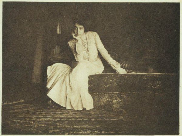 Curator: Joseph T. Keiley, known for his contributions to the Pictorialist movement, created this haunting portrait, titled "Portrait--Miss De C." sometime between the 19th and 20th century. It’s a photogravure and we see it here at the Minneapolis Institute of Art. What’s your first reaction? Editor: Oh, it's wonderfully melancholic. Like a page torn from a long-lost novel. The sepia tones feel heavy, like they're steeped in the past. It reminds me of old photographs found in antique stores, whispering stories of bygone eras. Curator: That sepia tone you noticed is very much by design. Photogravure as a process lent itself to that warmth, linking it to the visual language of established printmaking. It's a conscious effort by Keiley to elevate photography to the realm of high art. Editor: Absolutely. The subject's pose, too, speaks of carefully constructed artistry. She’s caught in thought, gazing beyond the frame with soulful eyes. There's a distinct air of Pre-Raphaelite influence, wouldn't you agree? I imagine her dreaming about unattainable love in a drafty castle. Curator: I think that connection holds weight. Pictorialists aimed for an aesthetic kinship with painting through their manipulation of photographic techniques. Notice the soft focus here, achieved during development. It minimizes sharp details, emphasizing mood and emotion over realistic precision. It’s almost like an echo. Editor: Right, almost painterly in its ambiguity. You know, it's interesting how portraiture shifted around that time. The subject is not defined through social markers of class or accomplishments, but seems caught in a moment of inner contemplation, where the boundaries of the visible become blurred. I feel like I could imagine my own story about her so easily. Curator: Well, Keiley's portrait really captures the essence of Pictorialism's ideals. His images prompt questions about photography's place in culture, it's relation to print-making, and how symbolism communicates memory. Editor: And to me, as a modern viewer, it evokes a longing for a world draped in mystery and quiet reflection. Like stumbling upon a secret world, or perhaps, rediscovering a piece of ourselves lost in time. What a gorgeous image to end our day on. Curator: Agreed, there's much to find here, much to find.