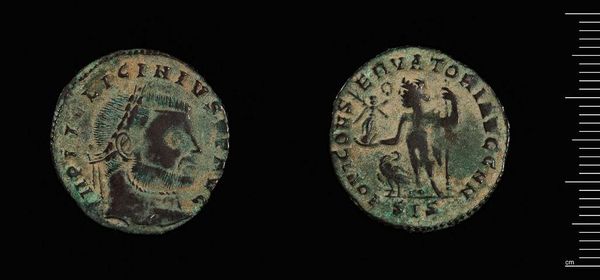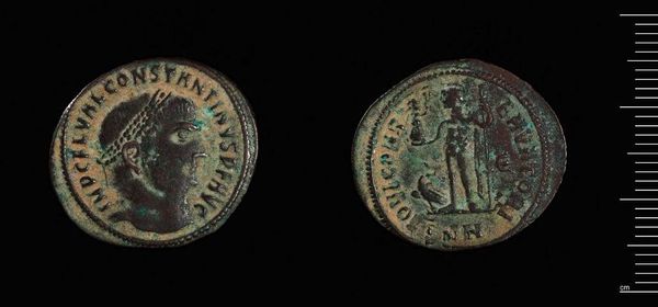 Curator: Let's discuss this bronze follis of Constantine I, minted in Rome. The portrait is quite striking. Editor: I’m immediately drawn to the visible wear; you can see how generations interacted with it. It speaks volumes about circulation and use. Curator: Absolutely. These coins were not just currency; they were propaganda. The emperor's image, the inscriptions—all carefully crafted to project power and legitimacy. Editor: And the materiality matters too. Bronze, a readily available metal, democratized the image of the emperor, placing it directly into the hands of the people. It’s a tangible connection. Curator: Indeed. Minting and distribution were crucial for maintaining control across the vast Roman Empire. Editor: Studying the coin production could teach us about the social fabric of the time; the hands involved in crafting this image. Curator: Thinking about this coin, it really makes you think about the role of imagery in shaping political narratives throughout history. Editor: For me, it is the constant, repeated physical engagement that echoes—a conversation with the past conducted through touch.