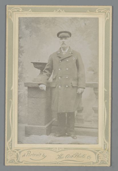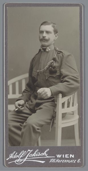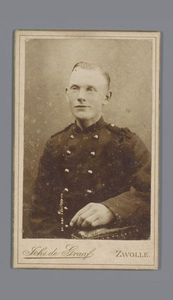 Editor: This is a photograph from between 1903 and 1920, entitled *Portret van een onbekende jongeman in uniform*, or *Portrait of an unknown young man in uniform*, taken by Jan van Roon. The sepia tones give it a certain gravity. What layers do you see beneath the surface? Curator: Indeed. The uniform itself is rich with cultural data. Think about its purpose – to signal belonging, authority, and often, sacrifice. What does the subject, this anonymous soldier, believe he represents through this garment? Does he see glory, duty, or simply a role he must fulfill? His rigid posture suggests a conformity to expectation, a visual submission to the collective. Editor: He does seem quite stiff, almost burdened. I wonder what "story" this portrait has in the present day? Curator: Look at the setting too – the plain backdrop, the posed stance. These were conscious choices. The photographer captured not just an individual, but also an ideal, a symbolic representation of military service. It's the early 20th century and what did serving the state and armed conflict look like at the time? Do we associate it more readily with heroism and hope? Editor: So the photo's power comes not just from what is visible, but also from what it communicates about values and collective memory? Curator: Precisely. The photograph captures a moment, but it also acts as a vessel, carrying with it a freight of cultural meaning that resonates through the years. Its impact derives from shared assumptions, aspirations, fears. The 'unknown' subject also allows people to project a variety of narratives to construct and maintain meaning over time. Editor: I didn't consider all those symbolic meanings embedded within it. It has given me new questions. Curator: It makes me ponder about visual traditions, cultural meanings, and continuities of state violence and their manifestations across generations.