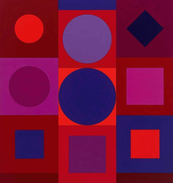 This is Victor Vasarely’s *Alphabet VR*, it’s a painting made in a square format with geometric forms. It’s so much fun to see how Vasarely approaches mark-making, making it look like anyone could do it - though of course, they can’t! The surface of this work is so smooth, the colour is so opaque. I am curious about how it was made - was it sprayed or rolled, or was it painted with a brush? Whatever he did, the color is so even, it creates this very cool surface. The whole image is made up of squares, and it looks like he used a stencil for the circles. I really like the way that this allows the shapes to nestle against each other. Vasarely’s project reminds me of artists like Bridget Riley or Josef Albers, who were similarly interested in the way that geometric abstraction could trigger optical illusions. It’s a pretty neat trick to see how simple shapes can create complex experiences, don't you think?