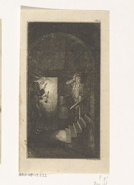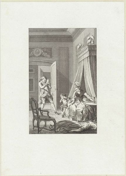 Editor: So, this is "Smidse" by Pieter Willem van Megen, dating from 1760 to 1785. It’s an engraving, etching, and pen drawing all rolled into one! I find the depiction of labor here quite striking. What catches your eye when you look at this piece? Curator: I notice the way van Megen presents labor not just as a means of production, but as a social performance. Consider the setting: this isn't just any blacksmith's shop, but a space imbued with theatricality. Do you see how the figures are arranged, almost as if on a stage? Editor: Yes, it does feel like a scene from a play! The viewer is positioned almost as an audience member. Curator: Precisely! And the central figure, the well-dressed observer, is crucial. What do you make of his presence in this workshop setting? Editor: He seems like an outsider, maybe a patron or someone of higher status visiting the workshop. It highlights the social divisions, doesn't it? He isn't involved in the manual labor, but is rather observing. Curator: Exactly! The image subtly plays on these social dynamics. Notice the attention to detail in the rendering of his clothing compared to that of the workers. It is interesting how these images served as both documentations of daily life and subtle commentaries on the existing social hierarchies. The Rijksmuseum as the gallery housing this today is quite far from this, wouldn't you say? Editor: Absolutely. It's thought-provoking to see how the same image could reflect and reinforce social norms back then and, displayed here now, almost prompts a critical examination of those same structures. Thanks! Curator: Indeed! It reveals how art acts as both a mirror reflecting its time, and a lens through which we can examine the present. A productive reflection, I would say.