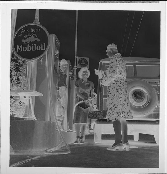 Curator: Isn’t it funny how a simple snapshot can hold so much? This is an untitled piece by Jack Gould, a gelatin silver print of a family seemingly on a road trip. The dimensions are modest, only about 5.7 x 5.7 cm. Editor: It's dreamlike, almost ghostly. The reversed tones create such an eerie feeling, like a memory fading. What exactly is that in their hands? Curator: I believe they're consulting a road map. There’s something beautifully poignant about the everyday nature of the scene, juxtaposed with the photographic technique. It asks questions. Editor: Right, but let's think about what it is to reverse tones in a silver print. It’s a chemical process, time, labor... and silver! It’s all about the resources used to build this, not just the scene depicted. Curator: True, the materiality is crucial here. And the ghostly effect maybe isn't so bad--to me, it elevates the mundane and speaks volumes about the human condition and the journey. Editor: I guess it does show how something very basic can be elevated, depending on the method, or medium. Curator: Exactly. The small scale also makes it feel quite intimate. Editor: Fair enough. I suppose I can see the beauty in that, even within the means of production.