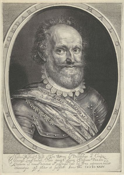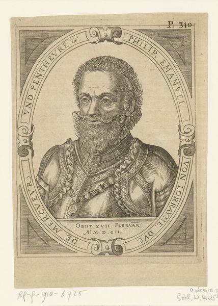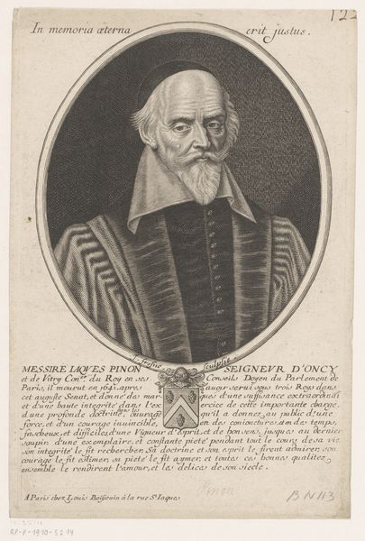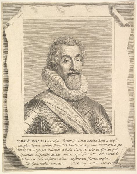 Editor: This is a portrait of Hendrik IV, King of France and Navarra. It’s an engraving, made between 1642 and 1694 by Nicolas de Larmessin, and is now at the Rijksmuseum. The intricate detail is amazing. It feels very formal, regal. What's your perspective on it? Curator: What I see is not simply a royal portrait, but a carefully constructed piece of propaganda designed to cement Henri IV's legacy. Think about the context: created decades after his death during a period of immense religious and political upheaval. The baroque style lends it grandeur, but the real message lies in its details. Notice anything interesting about his clothing, or the text framing the portrait? Editor: He’s wearing a very ornate ruff and sash with what looks like a cross hanging from it. The text is difficult to read but there's a coat-of-arms as well. It feels like it is emphasising his importance, doesn't it? Curator: Exactly! The cross likely references the Order of the Holy Spirit, associating him with religious authority, even though his reign was marked by religious conflict. Consider how the artist strategically employs symbols of power to project an image of stability and divinely ordained leadership. How does this image contribute to a larger historical narrative, do you think? Editor: Well, I suppose it reinforces the idea of the King as a strong and legitimate ruler, legitimizing the monarchy even after periods of conflict and questioning of its authority. It is attempting to fashion and burnish his image for posterity. Curator: Precisely. And by extension, it tells us something about how rulers try to control the historical narrative about themselves. It's a visual statement crafted to persuade. What do you make of that now? Editor: It is more than just a pretty picture. It is like a very carefully curated Instagram account designed to shape our perception of history. Thanks, I'm looking at it differently now. Curator: That's right. Art doesn't exist in a vacuum. Exploring these contexts opens up avenues to critical and interdisciplinary understandings, highlighting art's potent interplay with social, cultural, and historical forces.