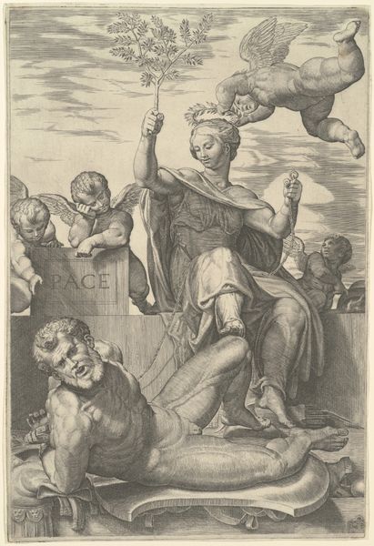 Editor: This engraving by Balzer Dahl, created in 1853, depicts "Kong Svend fanges af Jomsvikinger"—King Svend captured by the Jomsvikings. The stark black and white and the linear details create a dramatic, chaotic scene. What is your interpretation of this work? Curator: From a formalist perspective, it is important to first acknowledge that this print privileges line above all else, imbuing the image with tremendous energy and directional force. Note how Dahl deploys hatching and cross-hatching in strategic densities to modulate tone and volume, from the roiling waves to the massed figures both onboard ship and in the lower register frieze. Are you drawn to any particular structural relationships in the image? Editor: I'm struck by the contrast between the turbulent activity above and the more serene procession below. The lower scene seems to lack depth. Curator: Precisely. The division into these two distinct registers creates a tension. The figures above, though caught in violent action, are rendered with considerable attention to musculature and facial expression, while those below are flattened, almost archetypal, lacking in individuality. What impact do you think the artist intends through such marked disparity? Editor: Perhaps the contrast is to highlight the 'timelessness' of the procession of power? Is he juxtaposing a specific historical moment with a larger, more abstract idea? Curator: It could suggest such a contrast, yet through its composition, the picture becomes less about pure historicism, but more about an exploration of binaries: violence and serenity, specificity and archetype, depth and flatness. Editor: That’s given me a new lens to look at Dahl’s work and engraving in general. Thank you. Curator: My pleasure; indeed, considering form as an active agent refines and elevates understanding.