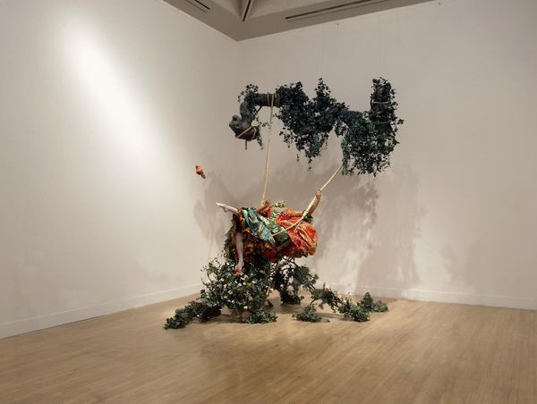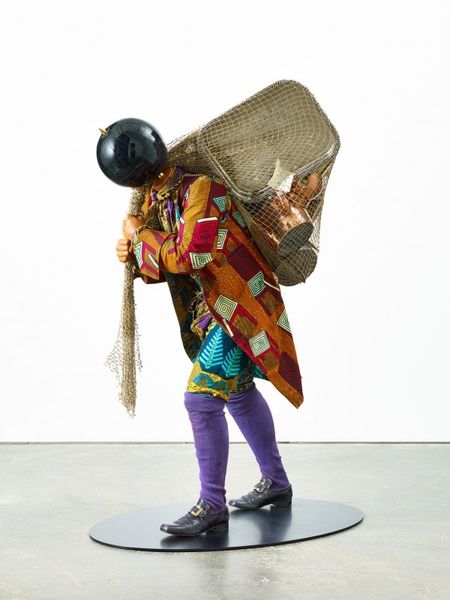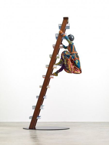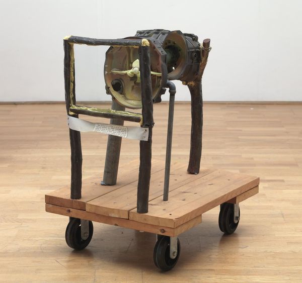 Curator: This installation by Maurizio Cattelan, simply titled "Untitled," dates to 2002. Editor: My first thought is absurdity. The levitating donkey, laden with...stuff? It feels like a dark joke about labor, about carrying burdens. The monochrome palette really underscores the seriousness too, in a way. Curator: The donkey, as you say, hangs suspended, rigidly attached to a cart piled high. Note the impeccable, almost hyperrealist detail in the animal’s form, yet utterly divorced from reality by its impossible situation. It presents an intriguing study of form and space. Editor: It screams about the precarity of work, doesn't it? Think about migrant labor, about the endless toil inflicted upon marginalized bodies. This isn't just formal play; it’s a powerful visual metaphor for systemic exploitation. The loaded cart emphasizes the weight of oppressive systems, right? The donkey *can't* move forward! Curator: An interesting perspective. I’m more compelled by the formal composition—the contrast between the solid, heavy cart and the suspended animal, creating a visual tension that is, in itself, profoundly interesting. And consider the careful arrangement of the parcels on the cart; Cattelan uses a rigorous structural vocabulary. Editor: Structure always reflects ideology! It can't be divorced from these contextual factors! The levitation introduces a sense of uncanny, magical realism; it makes you ask why *this* beast of burden? It's surreal in a way that calls for real-world engagement and intervention. Curator: Certainly, your reading provides a framework beyond the aesthetic properties. Still, it's a very skillfully realized physical structure! Editor: True. But I’d argue that its power lies precisely in its social commentary! The form demands attention because of what it signifies. This installation makes us see.
