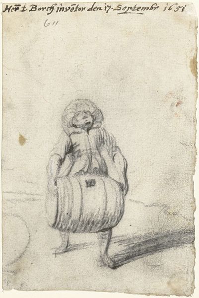 Harmen ter Borch created this quick sketch of a woman carrying a basket using pen in the second half of the 17th century. Ter Borch, working in the Dutch Golden Age, when the Netherlands was a major center of global trade, depicts a woman from the back, weighed down by her labor. Her posture, bent under the weight of the basket, speaks volumes about the physical demands placed on working-class women during this era. While Ter Borch came from a privileged background, his choice to depict this woman suggests an engagement with the lives of those often overlooked in the grand narratives of Dutch history. The anonymity of her representation—her face hidden from view—invites us to consider the countless untold stories of women whose labor sustained the booming Dutch economy. It reminds us that beneath the surface of prosperity were complex social dynamics and hidden labor.