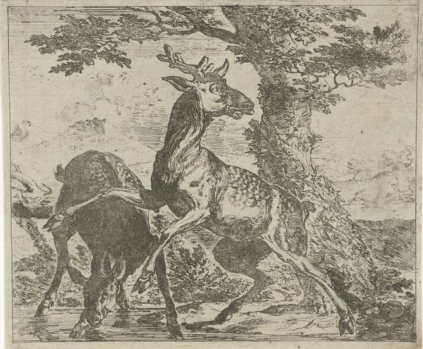 Curator: Here we have "Renard Goes with the Badger to Court to Appease the Lion's Anger" created sometime between 1650 and 1675. The artist is Allart van Everdingen and it's an etching, engraving and print of some kind, now residing at the Metropolitan Museum. What catches your eye initially? Editor: Well, immediately, I sense a kind of agitated energy. There’s a dynamic flurry in what's presented, which seems more dramatic than appeasing. Curator: It’s one of several works Everdingen made illustrating the medieval tale of Renard the Fox. This particular scene depicts Renard, the fox, in the company of a badger, journeying to court to placate the Lion’s anger. Editor: The horses, seemingly caught mid-gallop or mid-buck, really underscore the tension you mentioned, don't they? Are they symbolic, or more literal? Curator: Ah, now that's a fascinating question. While the horses aren't directly characters from the Renard tale, animals in these kinds of narratives often embody human traits or social classes. Given the story revolves around courtly intrigue, these horses perhaps represent nobility caught up in Renard's machinations. The animals themselves can each function as signifiers of different aspects of character— the clever fox, the honest badger, the powerful lion. Editor: Yes! The fox is an old archetype with layers of associations. Here, he isn't simply tricking the powerful lion, it looks like something has already happened between them, that this is a journey to make amends of some kind. Curator: Precisely. And Everdingen’s use of etching and engraving to create the image—those fine, sharp lines—adds to the impression of intricate plots and hidden meanings. Every detail feels deliberate, like a piece of a larger, more complex puzzle. It allows an intimate glimpse into both social commentary, the timeless play of power dynamics that's always happening in these narratives. Editor: Looking closer, it strikes me how modern it feels. The idea of animals acting as surrogates for human foibles…it's echoed even today in animation and storytelling. Thank you for unfolding the narrative threads and hidden symbolism, it really enhances my understanding.