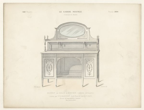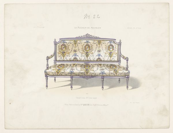 Editor: This is "Canapé", a print made with ink and watercolour on paper by Léon Laroche, sometime between 1895 and 1935. It depicts a small Louis XVI sofa. I'm immediately drawn to how decorative and almost fragile it appears. What stands out to you? Curator: I see a study of production. Think about it: the image depicts a piece of furniture meant for domestic use, specifically, for *leisure*. But here, that leisure is deferred. It's represented as an *image*, meticulously crafted by Laroche through printing, ink, and watercolor. Editor: So you're saying the image itself becomes an object of labor? Curator: Precisely. Consider the socio-economic implications of this process. We’re not just looking at a pretty sofa. We’re witnessing the translation of material object into reproducible image and that transformation required resources and skills, from the ink and paper to the labor of the printer and artist. And who was the intended consumer of this image? Someone invested, directly or indirectly, in that system of production and consumption. This is "decorative-art", where does functionality fit within that decorative style? Editor: It is thought-provoking to consider the sofa not just as an object, but as a node in a network of material production, consumption, and representation. Curator: Exactly! Thinking about art from a materialist perspective urges us to look beyond aesthetic appeal and understand the forces that shape its creation, dissemination, and reception. Editor: This gives me a new appreciation for understanding a work’s process and its position in broader economic systems. Thank you.