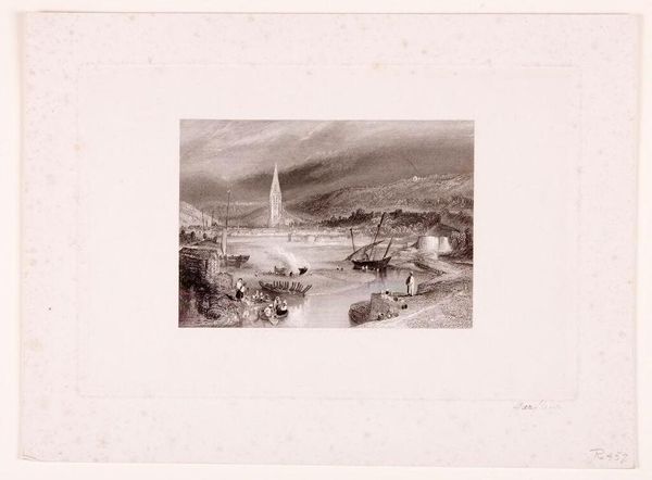 Editor: This sepia print, "Inverary," by Joseph Mallord William Turner, feels so still and contemplative. The composition is just beautiful. What strikes you most about its formal qualities? Curator: The etching presents a structured interplay of light and shadow. Note how Turner employs horizontal lines in the water and distant land to anchor the composition, juxtaposed against the verticality of the boat's mast, creating a balanced tension. Consider also the tonal gradations and what they signify. Editor: The etching technique seems key to achieving that. Curator: Precisely. Turner’s mastery lies in his ability to manipulate the medium to evoke a sense of place. Reflect on how the formal elements contribute to the overall aesthetic experience. Editor: I see it so much more clearly now, looking at the interplay of light and shadow. Curator: Indeed, by examining its form, we gain a deeper appreciation.