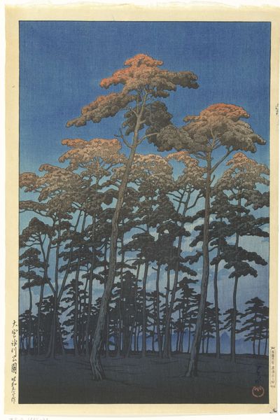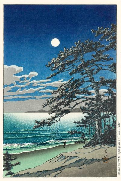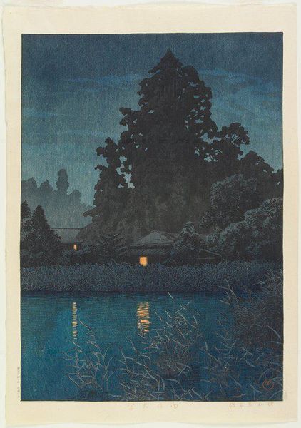 Curator: Here we have "Full Moon at Magome," a woodblock print by Hasui Kawase, created around 1930. It’s an exquisite example of Shin-Hanga, a style that revitalized traditional Ukiyo-e prints. Editor: Ooh, it feels like stepping into a dream, a blue dream. That moon, peeking through the trees, is so inviting. And those perfectly lined up plots... It gives me a sense of both order and mystery. Curator: The image is carefully constructed, featuring strong vertical lines from the trees contrasting with the moon's gentle curve. This tension speaks to the era's grappling with modernity. We must understand the history of the work's representation to really appreciate what we see here. Consider the printmaking process in light of class politics, for instance. Who got to own images like this, and what did they mean to that population? Editor: That's true! It makes you wonder who that light in the little cottage is for! Are they even seeing the full moon through those trees or too focused on keeping warm and eating? In art school we sometimes used woodblock printmaking...I remember the labor in cutting it! Curator: Precisely! This kind of meticulous detail links this artwork back to themes of labor, tradition, and class that run deep within the history of woodblock print production in Japan. The work creates a very specific cultural context to understand its relevance to this day. Editor: Yeah. Still...there's a timelessness in capturing that moment—the full moon’s quiet, hopeful presence amidst daily life. I get lost imagining the world those trees grew up in. It pulls me in! Curator: Indeed. "Full Moon at Magome," therefore, resonates not just as a visually beautiful scene but as a cultural and social artifact reflecting early 20th-century Japan. Editor: Thinking about this piece—that's what great art does. It gets into your heart a bit, ya know? Curator: Agreed. Considering Hasui's position in his time encourages that empathy. It serves to remind us to look closely and deeply at art's purpose, place, and impact.