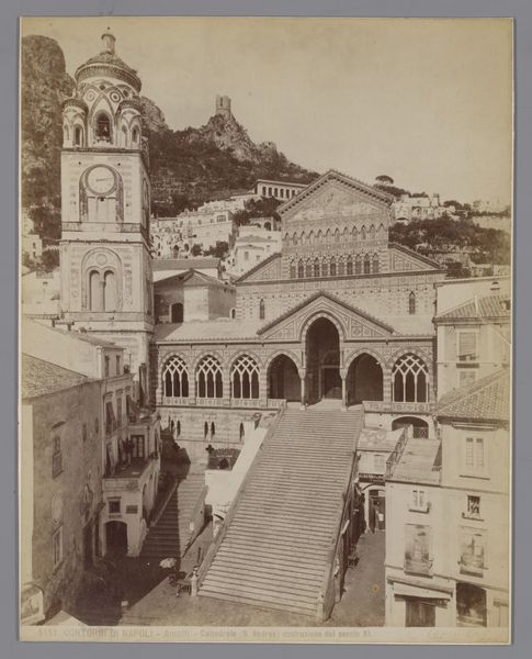 This photograph, taken by Giorgio Sommer, captures the Cathedral of Amalfi with striking clarity, emphasizing its architectural mass against the backdrop of the Italian landscape. Sommer's composition plays with geometric forms, from the sharp lines of the ascending staircase to the rounded dome of the bell tower. The contrast between the rigid man-made structures and the organic forms of the cliffs behind creates a visual tension, highlighting how architecture attempts to impose order on the natural world. Look at the intricate patterns adorning the facade of the Cathedral; Sommer's sharp focus allows us to appreciate this complexity, transforming the building into a semiotic field of cultural and religious meanings. The photograph destabilizes conventional representations of landscape by foregrounding architectural intervention. It encourages us to consider how buildings act as texts, encoding cultural values and power dynamics within their very structures.
