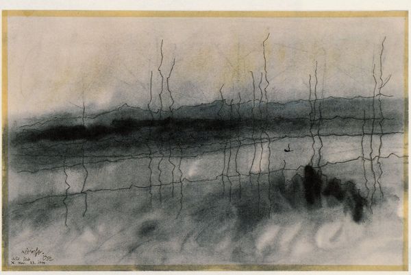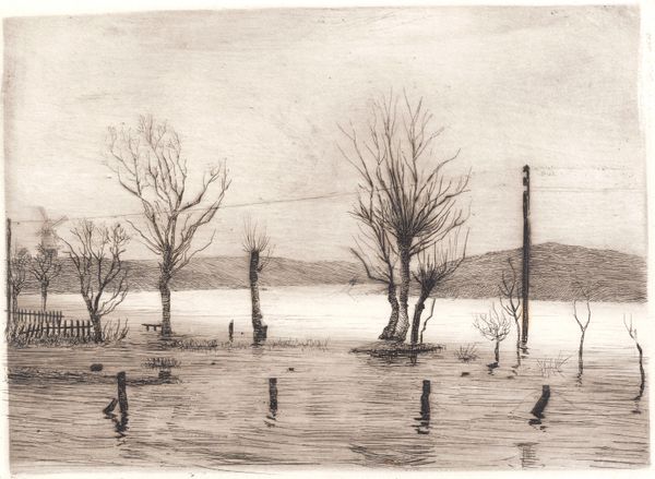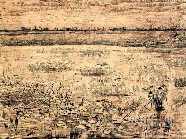 Isaac Levitan rendered "Spring. Cranes flying." using pencil on paper. The image presents a subdued palette where light and shadow interplay across the landscape evoking a sense of anticipation. The composition is structured around the horizon line which divides the sky, filled with dynamic cloud formations and a line of cranes, from the waterlogged earth. The stark trees punctuate the horizon and their reflections extend into the water, blurring the boundary between the solid and the ephemeral. The texture is achieved through dense, layered pencil strokes which capture the dampness of the scene. Levitan explores the theme of transition and renewal. The cranes may symbolize hope and liberation. The piece engages with the formal language of landscape painting, pushing it towards a more subjective, emotionally resonant mode of expression. Ultimately, it is the balance between the detailed foreground and the atmospheric background that defines this work. The drawing invites us to contemplate the cyclical nature of life. Each viewer is invited to bring their own experiences, emotions and interpretations to bear on this evocative landscape.