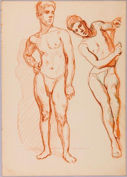 Curator: Before us is a drawing titled, "Standing and Reclining Male Nude Youth with a Study of a Shoulder," attributed to Frank Samuel Eastman. It's a striking composition in red chalk. Editor: The red chalk gives the work a warm, almost sanguine feel, though the linework seems tentative, perhaps exploratory. Curator: Consider the historical context; nude studies often served as academic exercises, reinforcing societal views on ideal masculine forms and the male gaze within art institutions. Editor: Yes, and Eastman’s handling of line weight creates a delicate balance between form and void, drawing attention to the contours of the figures while leaving room for the eye to complete them. Curator: This piece, therefore, exists in a tension between anatomical study, artistic expression, and potentially, reflections on gender dynamics of its time. Editor: I agree; the deliberate choices in line and shading contribute to the overall aesthetic impact. It's a study of form, definitely, but also of light and shadow. Curator: Absolutely, it shows how art can be both a product of its time and a space for nuanced considerations. Editor: A wonderful piece, regardless. I’ll be contemplating the artist's choices further.