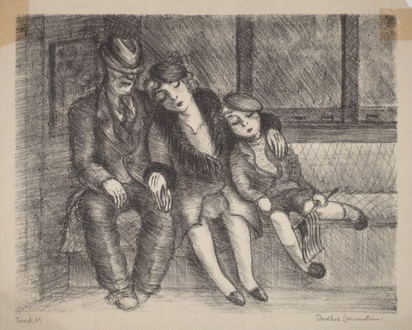 Editor: Frederick Walker’s “Philip in Church,” engraved by Swain, presents a poignant scene. The subdued mood, rendered in detailed lines, invites reflection. What symbolic weight do you see within this image? Curator: Notice how the figures are arranged, a family unit enclosed in a pew, almost like a stage. The act of reading becomes a symbol of learned tradition, yet the averted gazes hint at inner thoughts, perhaps dissent or boredom. Does the church setting amplify or diminish these individual experiences? Editor: That's interesting, I hadn't considered the averted gazes. It's like they're physically present but mentally elsewhere. Curator: Exactly. It speaks to the complex relationship between public ritual and private emotion, a tension echoed throughout history and still resonant today.